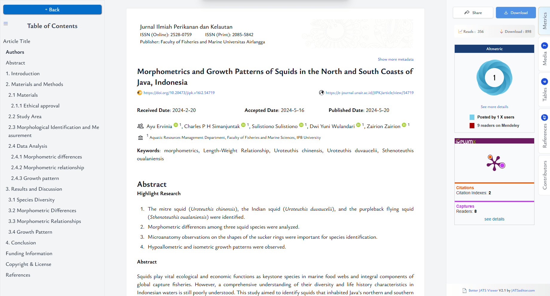 In addition, the JATS Editor plugin is bundled free with Better JATS Viewer, a JATS viewer developed by the openjournaltheme (OJT) team. This viewer displays JATS XML articles with a cleaner and more functional appearance. For example, it already supports PlumX Metrics and Dimensions Metrics displays without the need for additional plugins. This means readers can immediately view statistics on citations, views, and article interactions in real time on the galley page. This enhances reader interactivity and engagement, which ultimately helps improve the visibility of journals on search engines and academic platforms.