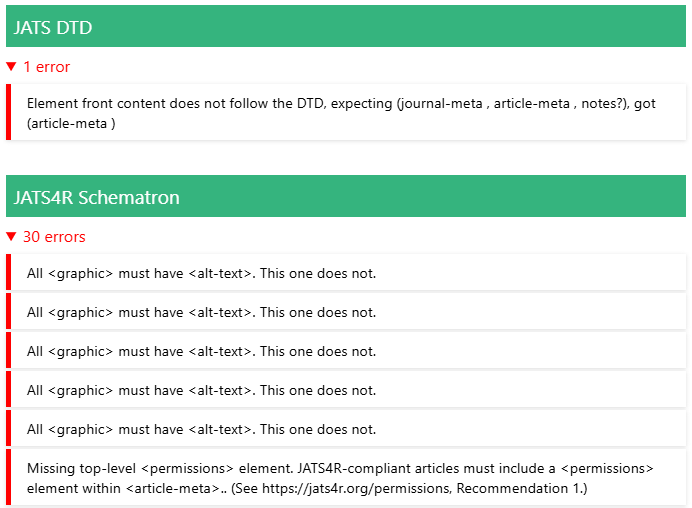 Errors such as “Element front content does not follow the DTD” mean that the file structure does not follow the order required by the JATS standard; <journal-meta> should appear before <article-meta>, while errors such as “All <graphic> must have <alt-text>” or “Missing <permissions>” indicate that important elements required by JATS4R compliance are not yet in the file.
