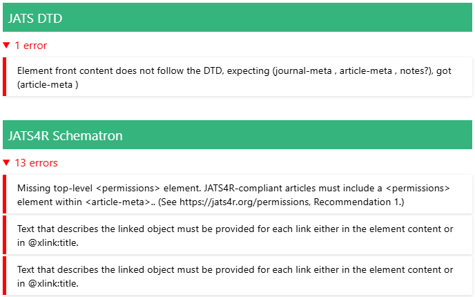Errors like this mean that your JATS file does not comply with DTD and JATS4R standards, so indexing systems such as PubMed, EBSCO, or DOAJ may reject the file.