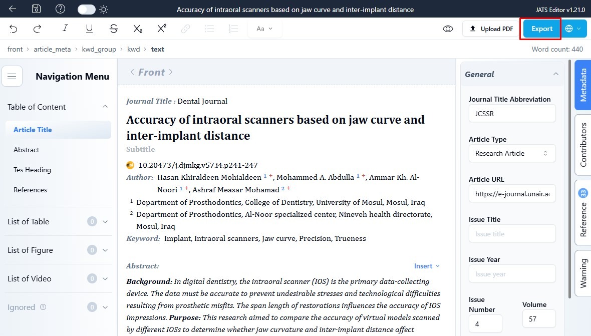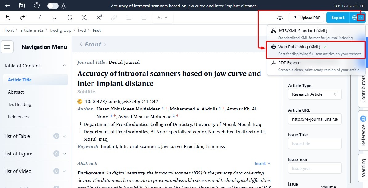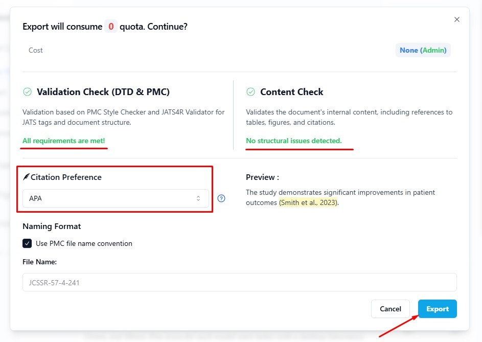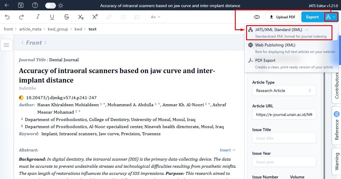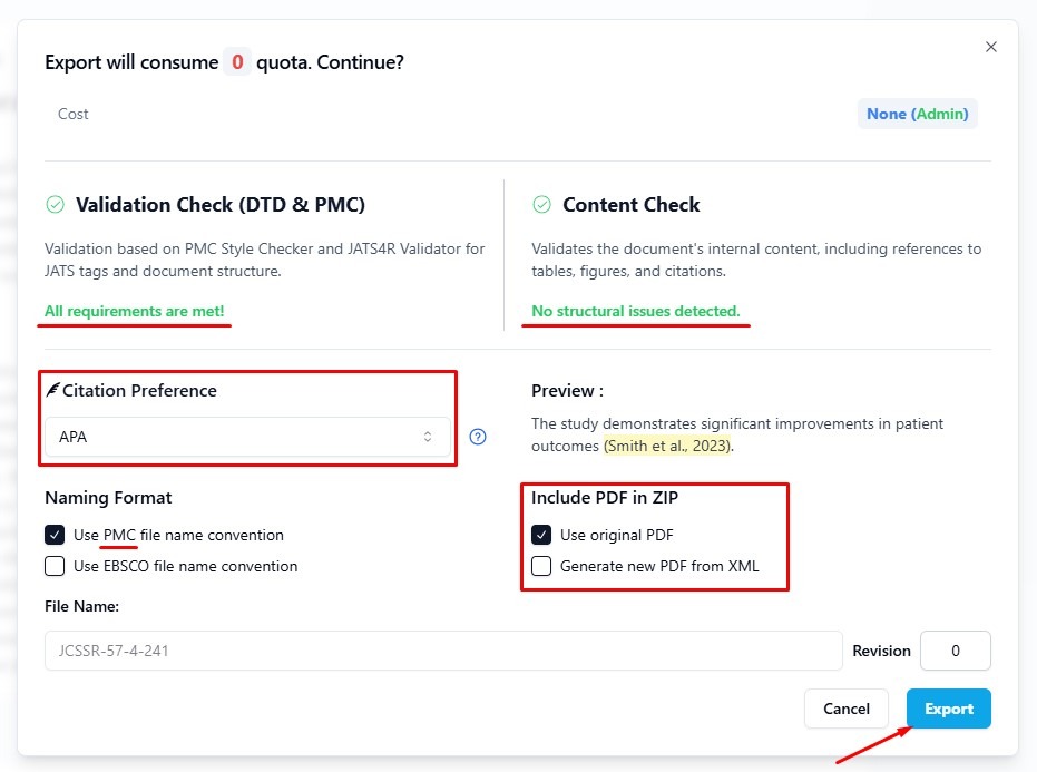 Before exporting your JATS XML file, make sure you have selected the correct export option that matches your needs.