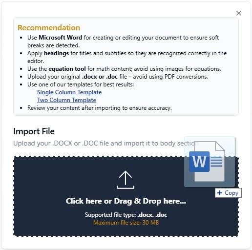To make your work easier in article editing, make sure in the article you want to import, you have deleted the Metadata section of your article.