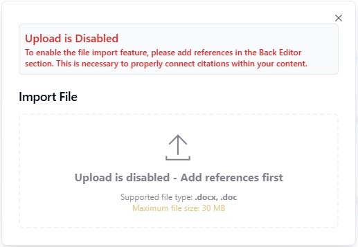 We recommend adding the references first before importing your article, as the import process automatically links in-text citations to the reference list. This is why references need to be entered beforehand.